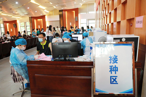 在各职能部门的密切协作以及现场工作人员和学生志愿者的引导下,现场井然有序。参加疫苗接种的师生员工依次进入等候区、核对区、接种区和留观区,仔细阅读温馨提示材料,如实填写疫苗接种知情同意书;医务人员认真为师生一一核对信息、读取接种预约码、进行健康评估及疫苗接种,并耐心交代注意事项。