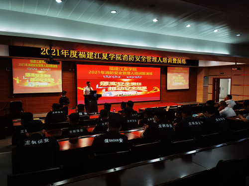 福州市“六进”防火宣传中心姚永军详细解读了消防法规,并结合近年来全国火灾案例,讲授了预防火灾、扑救初起火灾、组织人员疏散逃生等消防安全知识,对火灾报警系统运行原理以及如何使用、检查消火栓、灭火器、安全出口指示灯等消防设备设施等内容作了介绍。讲座后,保卫处分批组织参训人员进行灭火演练。