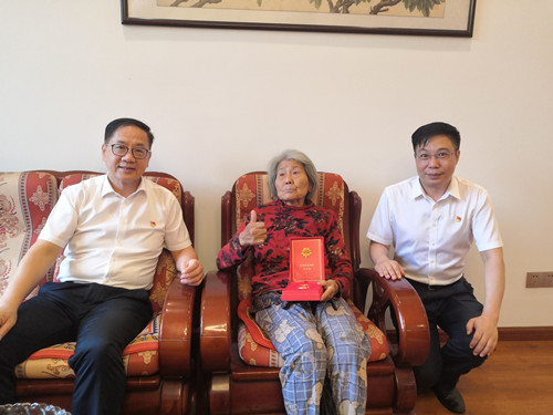 6月24日下午,校党委书记郑建岚前往看望93岁高龄、有着75年党龄的董淑礼同志。郑建岚书记和董淑礼同志亲切交谈,详细询问她的家庭生活和健康状况,并为其送上“光荣在党50年”纪念章与慰问金。郑建岚表示,在建党100周年之际,党中央决定向老党员颁授“光荣在党50年”纪念章,充分体现了以习近平同志为核心的党中央对老党员的政治关怀和尊崇厚待。董淑礼同志感到非常光荣、格外激动,对组织上的关心和牵挂表示由衷的感谢。
