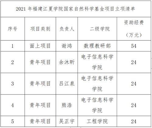 日前,2021年国家自然科学基金集中接收申请项目评审结果公布,我校立项数创新高,其中数理教研部获面上项目1项,电子信息科学学院、工程学院分获青年项目3项、1项,资助经费共计150万元。