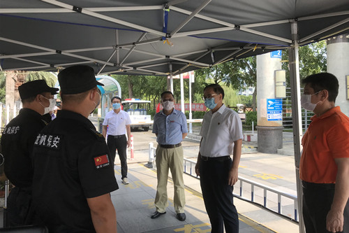 10月1日上午,校党委书记郑建岚、校长陈国龙和在校带班的校党委副书记王长勇带队走访校区大门、应急中心、图书馆和健康观测点等地,察看指导校园疫情防控和安全工作,看望慰问一线工作人员。