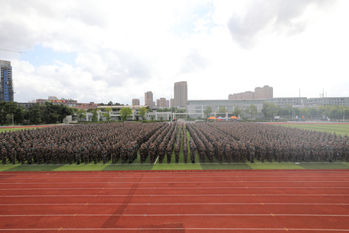 承训部队教官,学校相关部门负责人、各二级学院党委相关负责人、退伍大学生组成的小教员队伍、新生辅导员及全体新生参加大会。