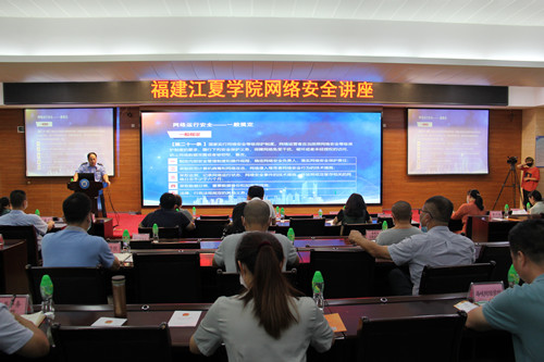 10月11日至17日是2021国家网络安全宣传周。10月14日下午,我校以线上线下结合形式组织师生同上一堂网络安全课,邀请省公安厅网安总队刘凌明警官作“健康上网 文明上网”专题讲座。副校长徐杰,校内各单位相关负责人、网站管理员共80余人参加讲座。