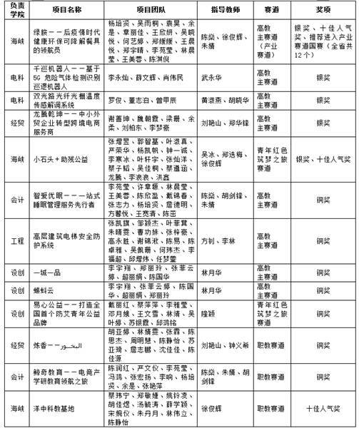 近日,省教育厅公布第七届福建省“互联网+”大学生创新创业大赛获奖名单。我校斩获高校主赛道银奖4个、铜奖4个、十佳人气奖1个;青年红色筑梦之旅赛道银奖1个、铜奖1个、十佳人气奖1个;职教赛道铜奖2个、十佳人气奖1个。