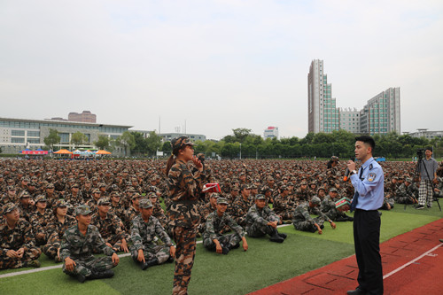 10月19日下午,我校采取线上线下同步方式在运动场举办“诚信进校园”主题宣传暨校园安全防范应急演练活动。校党委副书记王长勇,福州市公安局上街(高新区)分局政委余根钦等,学校相关部门负责人、各二级学院分管学生工作副书记、实验员、新生辅导员及全体新生共3500人参加。