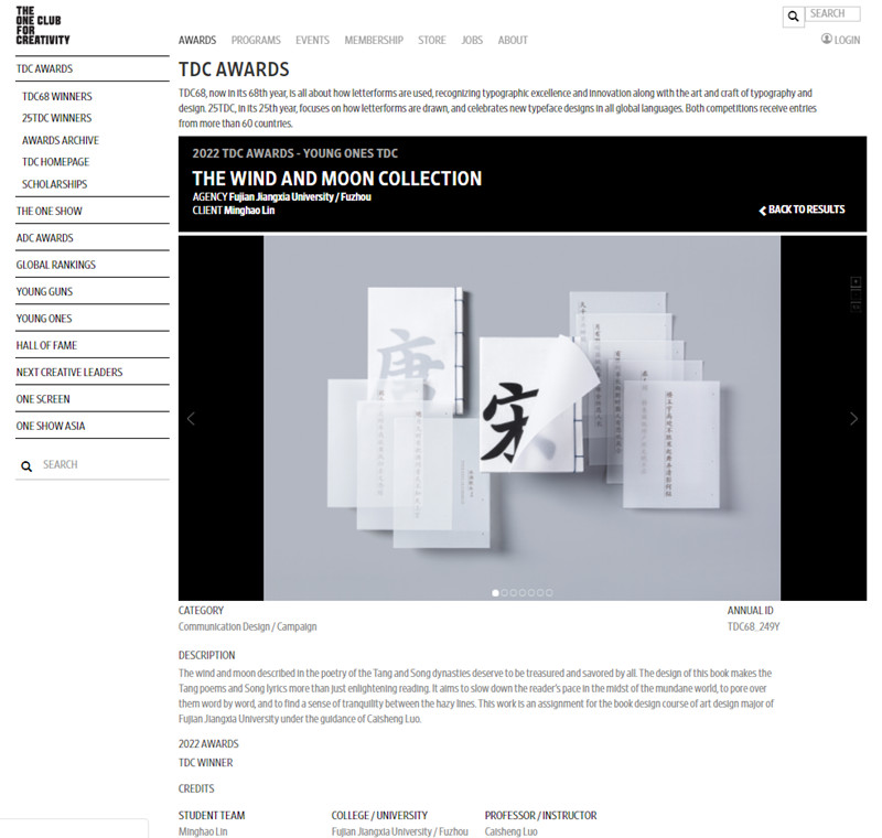 近日,纽约字体指导俱乐部(NY TDC)公布了2022年获奖名单。我校设计与创意学院教师罗才胜指导、2018级艺术设计学(面向中职)班学生林铭浩设计的书籍作品《风月集》获Young ones TDC学生奖,将收入至The world’s best typography年鉴,并参加获奖作品世界巡展。