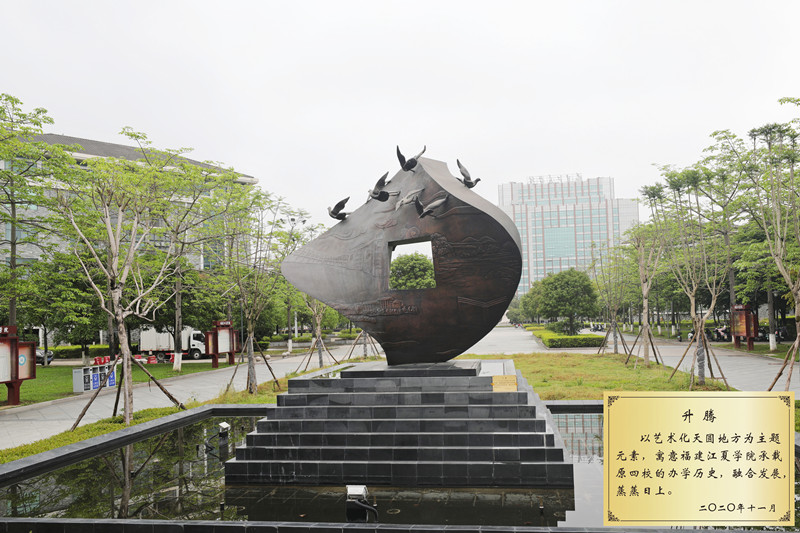“升腾”,以艺术化天圆地方为主题元素,寓意福建江夏学院承载原四校的办学历史,融合发展,蒸蒸日上。