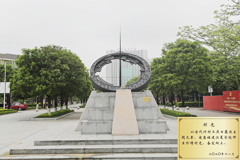“时光”,以古代计时工具日晷为主题元素,寓意福建江夏学院师生珍惜时光,奋发向上。