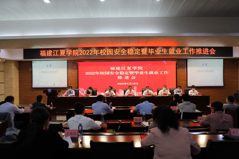 5月12日,福建江夏学院召开2022年校园安全稳定暨毕业生就业工作推进会,深入学习贯彻习近平总书记系列重要讲话和重要指示批示精神,贯彻落实党中央、国务院决策部署以及省委省政府工作要求,进一步做好校园安全稳定工作,推进毕业生就业工作。校领导郑建岚、王长勇、陈敏辉、刘慧宇、林正游、徐杰、林学坚出席会议。会议由校党委副书记、校长凌启淡主持。
