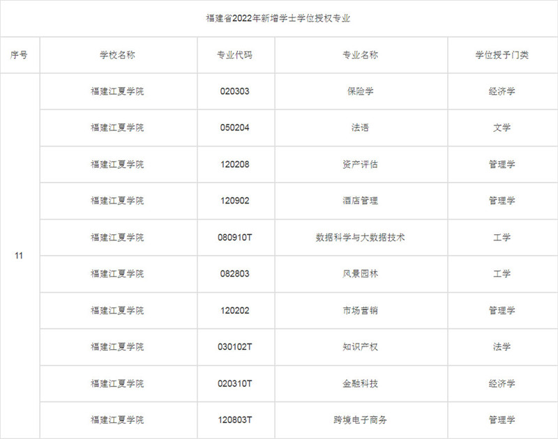 日前,福建省学位委员会公布2022年新增学士学位授权专业名单。我校第九批10个本科专业获批增列为学士学位授权专业。具体名单如下: